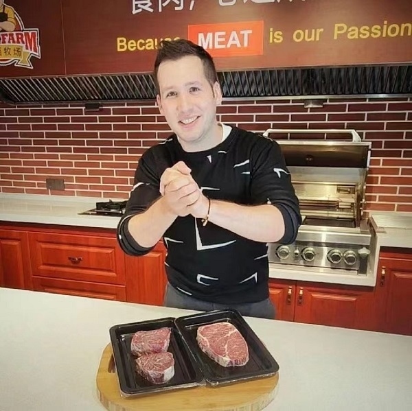 人民網(wǎng)北京3月24日電(符園園、古娜)“大家好,我是小高。一到冬天,我最愛吃的就是香噴噴熱乎乎的火鍋。所以我給大家?guī)砹宋覀兙臏?zhǔn)備的火鍋套餐?!敝辈ラg的高博睿,說著一口流利的中文,熟練地向大家介紹自己的牛肉產(chǎn)品。