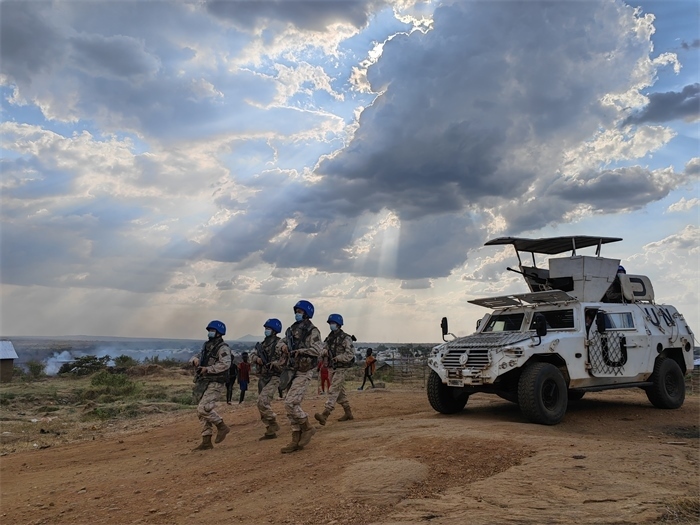 2022年12月,“劉老莊連”隨中國第九批赴南蘇丹(朱巴)維和步兵營奔赴維和戰(zhàn)場,重點擔(dān)負(fù)警戒巡邏、武裝護(hù)衛(wèi)、隔離沖突等維和任務(wù)。截至目前,“劉老莊連”累計行程1500余公里,高標(biāo)準(zhǔn)完成了各項授權(quán)任務(wù),受到聯(lián)南蘇團(tuán)各級高度贊揚。這也是英雄的“劉老莊連”戰(zhàn)旗第一次飄揚在非洲大地。