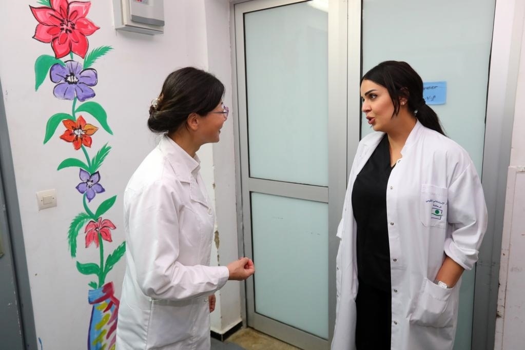 2023年2月26日,在位于摩洛哥本杰里爾的一家醫(yī)療中心,摩洛哥婦產(chǎn)醫(yī)生伊曼(右)和張茜在手術(shù)室外交談。新華社記者隋先凱攝