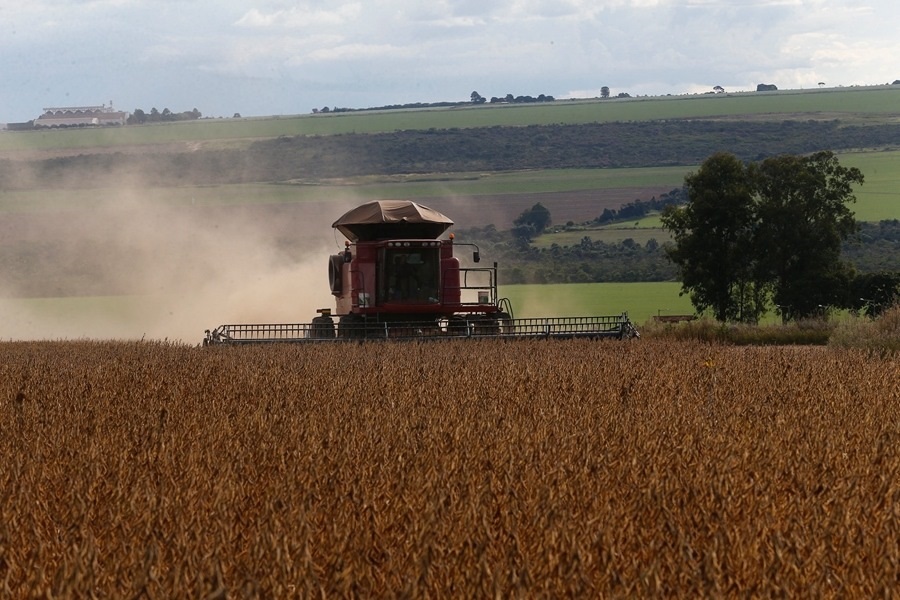 4月12日,在巴西戈亞斯州班德里尼亞農(nóng)場,農(nóng)機(jī)進(jìn)行收獲大豆作業(yè)。新華社發(fā)(盧西奧·塔沃拉攝)