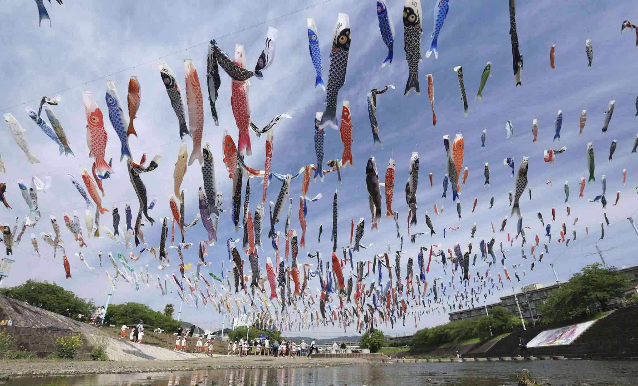當(dāng)?shù)貢r(shí)間2023年4月28日,日本大阪,大約1000條鯉魚旗在高摫市的秋田川河上空飄揚(yáng),慶祝5月5日兒童節(jié)。視覺中國