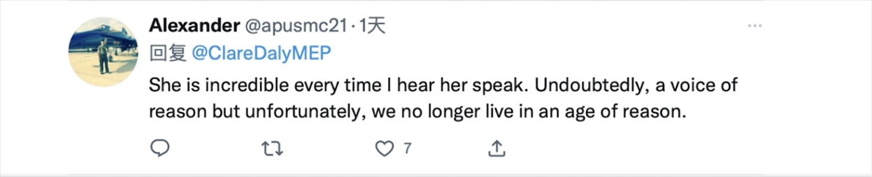 克萊爾·戴利28日在推特上發(fā)布了一條她于19日在歐洲議會全體會議上發(fā)言的視頻,她在視頻上方配文稱,“針對中國可恥的殖民傲慢應(yīng)該留在過去。問題很簡單。我們是想成為我們大西洋朋友的附庸,還是想與我們最大的貿(mào)易伙伴保持和平、獨立的關(guān)系?這個伙伴40年來沒有向任何人投過一顆炸彈。”