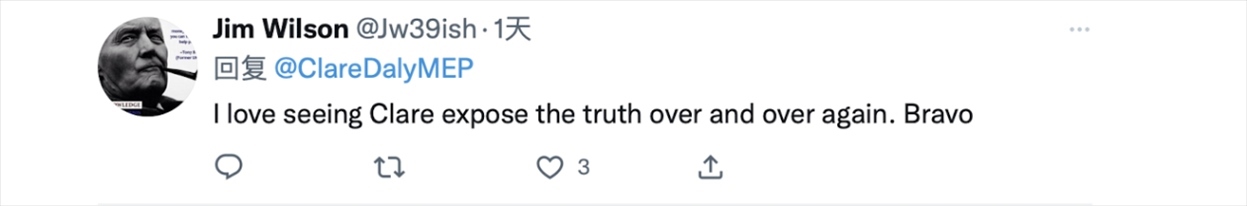 此前,克萊爾·戴利在接受環(huán)球時報記者采訪時,當被問及在歐洲議會中是否會因為自身的對華立場而受到壓力,戴利稱,那或許不是一種“壓力”,而是一種反華的種族主義和陳舊的觀念作祟。愛爾蘭的媒體把我和我的同事米克·華萊士妖魔化了,因為我們發(fā)表的一些評論被中國媒體報道,他們就給我們貼上“專制政權(quán)傀儡”的標簽。這種無知不能改變什么,所以我覺得不用擔心。我們的工作是利用歐洲議會這個平臺來代表歐洲公民的利益,而與中國保持良好關(guān)系符合歐洲公民的利益。