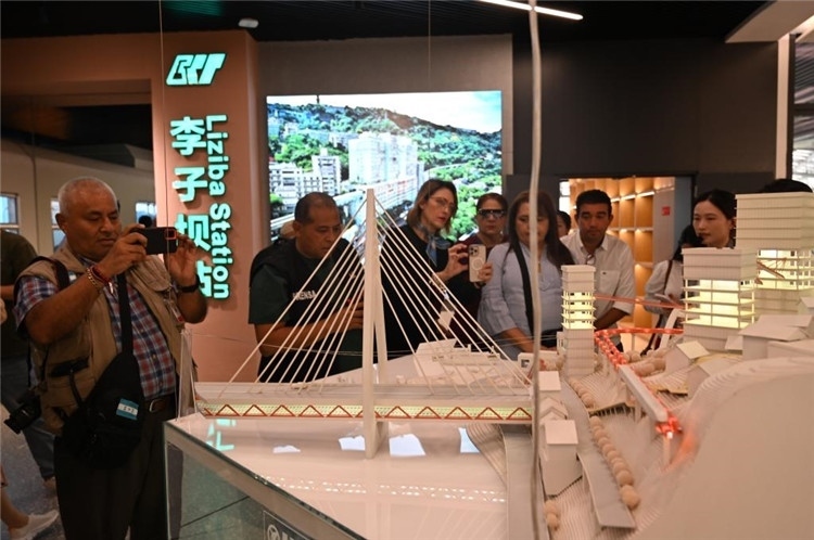 5月2日,在重慶市規(guī)劃展覽館,洪都拉斯媒體代表團(tuán)一行參觀重慶立體交通模型。新華社記者 趙佳樂(lè) 攝