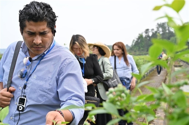 5月2日,洪都拉斯媒體代表團(tuán)代表團(tuán)走進(jìn)重慶市南川區(qū)大觀鎮(zhèn)藍(lán)莓產(chǎn)業(yè)示范基地。新華社記者 趙佳樂(lè) 攝