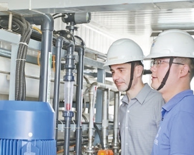 在巴西北里奧格蘭德州若昂卡馬拉市,中國國家電網(wǎng)巴西電力股份公司員工在檢查凈水設備。該苦咸水淡化公益項目讓800多個家庭喝上優(yōu)質飲用水。 新華社記者 陳昊佺攝