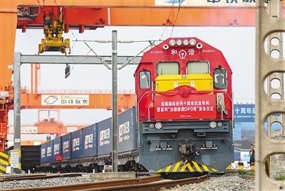 中歐班列是中法進(jìn)出口貿(mào)易的重要橋梁。圖為4月26日,為紀(jì)念成都國(guó)際班列十周年而開行的“法國(guó)郵政DPD專列”在四川省成都市青白江區(qū)國(guó)際鐵路港首發(fā)。白桂斌攝(人民視覺)