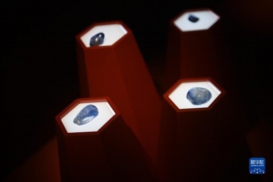 這是在陜西歷史博物館拍攝的藍(lán)寶石(5月11日攝)。天然寶石通過(guò)絲綢之路以商業(yè)貿(mào)易的形式進(jìn)入中國(guó)。