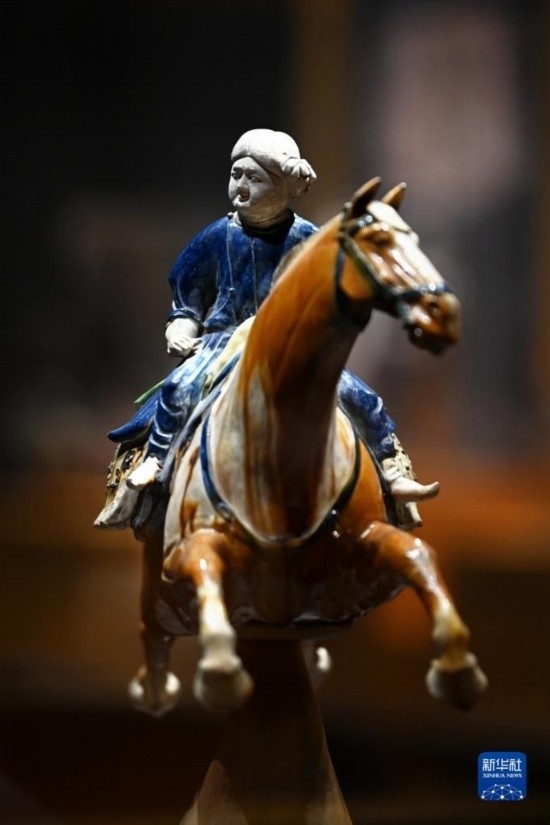 5月8日,游客在西安博物院參觀(guān)唐代三彩騰空馬。飛騰的三彩馬上騎有一胡俑,真實(shí)再現(xiàn)了絲綢之路上西域胡人急奔長(zhǎng)安的生動(dòng)形象。