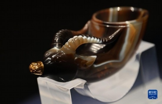 5月11日,游客在陜西歷史博物館參觀(guān)鑲金獸首瑪瑙杯。鑲金獸首瑪瑙杯的造型,與起源于古希臘的酒具“來(lái)通”相似,“來(lái)通”曾廣泛流行于中亞、西亞地區(qū),沿著絲綢之路不斷東傳進(jìn)入中國(guó)。
