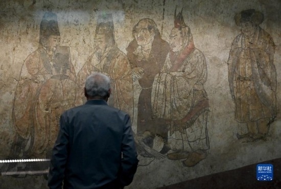 5月11日,游客在陜西歷史博物館內(nèi)觀(guān)看唐章懷太子墓《客使圖》。《客使圖》描繪的是唐代外交機(jī)構(gòu)鴻臚寺官員接待外國(guó)使節(jié)的場(chǎng)景。