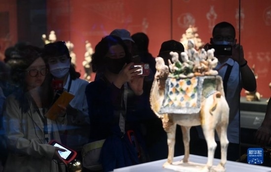 5月11日,游客在陜西歷史博物館參觀(guān)唐三彩駱駝?shì)d樂(lè)俑。這件唐三彩駱駝?shì)d樂(lè)俑既是唐代文化藝術(shù)、制作工藝發(fā)達(dá)昌盛的重要物證,也見(jiàn)證了絲綢之路上藝術(shù)的交流與融合。