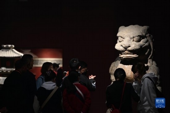 5月9日,游客在西安碑林博物館內(nèi)參觀(guān)唐代石獅。古代中國(guó)的獅子多通過(guò)絲綢之路由外國(guó)進(jìn)貢而來(lái)。