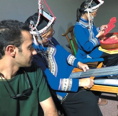 發(fā)展,是新疆留給納瓦爾的第一印象?!拔覀冏哌M了烏魯木齊這座中國西部的現(xiàn)代化城市,感受到了當?shù)孛癖姲簿訕窐I(yè)的生活?!痹谛陆畤H大巴扎,種類繁多的干果、色彩斑斕的艾德萊斯綢等特色產(chǎn)品讓人目不暇接?!拔矣龅搅艘晃皇炙嚲康牡靥簬煾?,他編織過程中的每一個手勢都充滿了韻律感。我陶醉于他的手藝,也被地毯精美且極具傳統(tǒng)特色的紋樣設計所吸引。我向他請教,他也熱情回答。我后來把這些美好的記憶都融入了作品當中?!奔{瓦爾說。