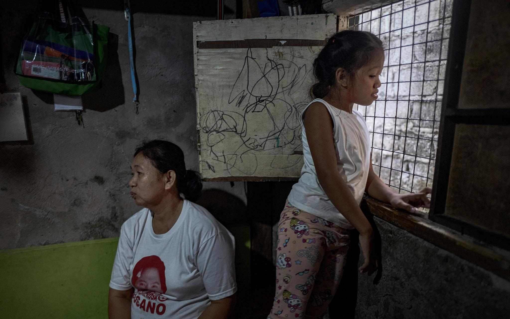 當(dāng)?shù)貢r間2023年4月15日,菲律賓馬尼拉,奎松市,Corazon Mercado(左)和她的女兒Bea坐在家里。據(jù)Corazon Mercado說:“我們買不起大瓶或散裝的必需品,我們只能買得起小袋的日常必需品?!?/p>