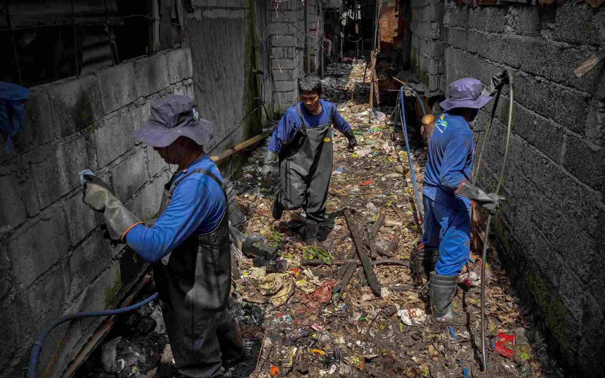 當(dāng)?shù)貢r間2023年4月15日,菲律賓馬尼拉,工人們清理一條被塑料垃圾堵塞的小溪。