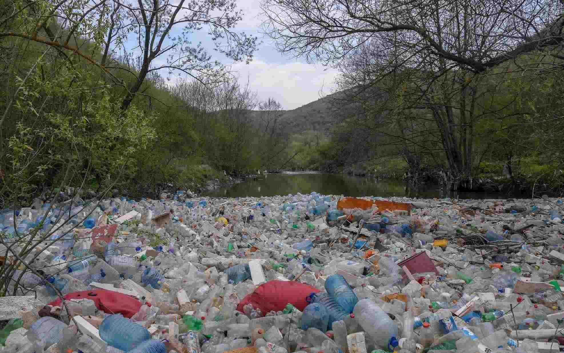 當(dāng)?shù)貢r間2023年4月22日,科索沃地區(qū),摩拉瓦河漂浮著大量廢棄的塑料瓶和其他垃圾。