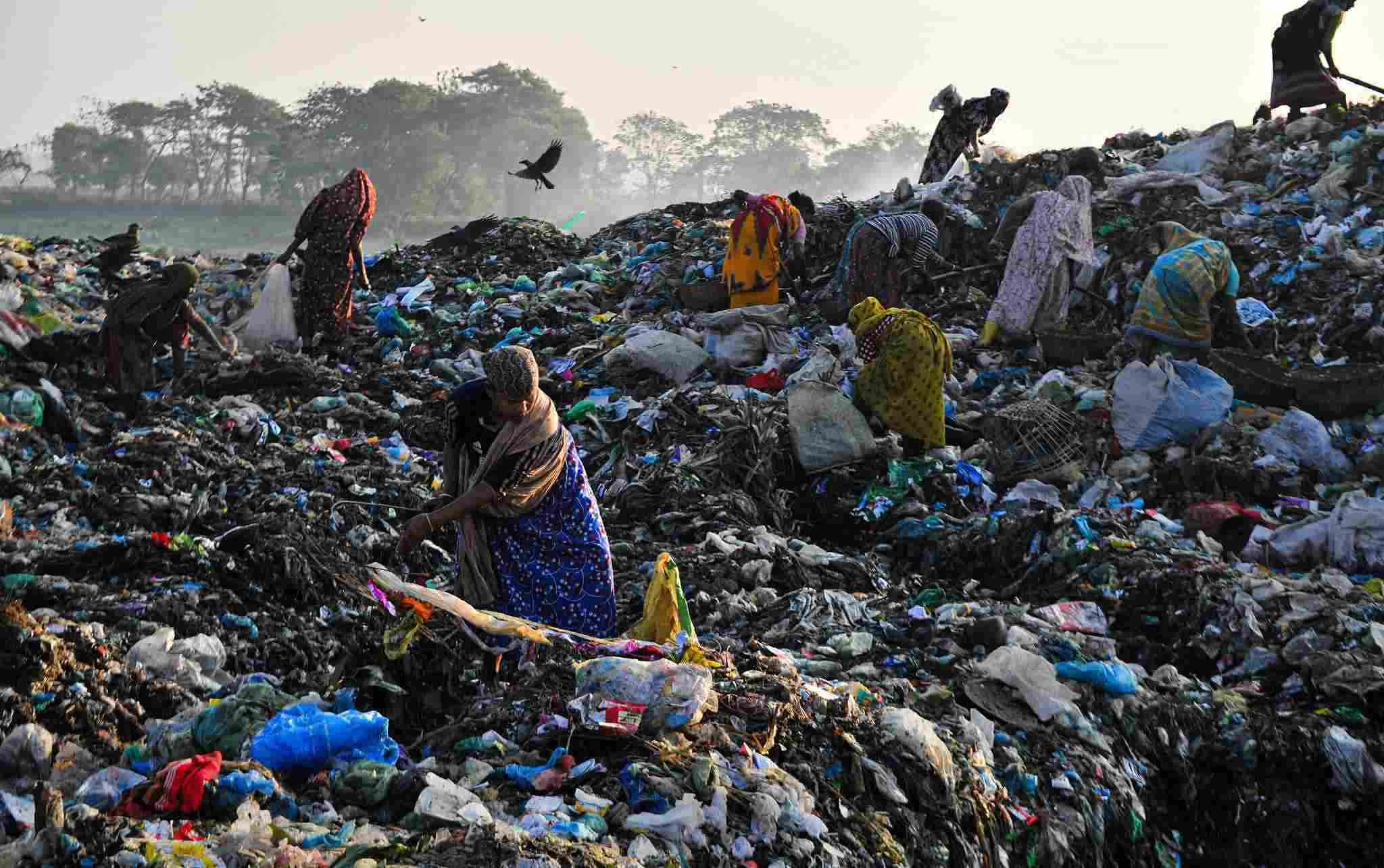 當(dāng)?shù)貢r間2023年1月2日,孟加拉國錫爾赫特,工人們在一個有毒廢物傾倒場工作。