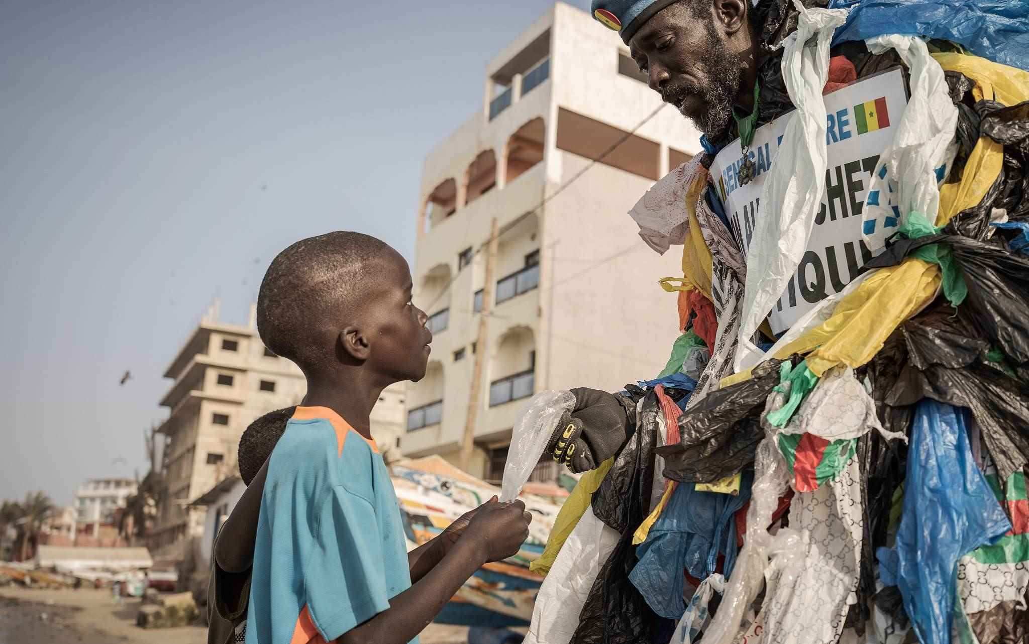 當(dāng)?shù)貢r間2023年4月5日,塞內(nèi)加爾達喀爾,49歲的塞內(nèi)加爾環(huán)保活動家莫杜·法爾,被稱為“塑料人”,和一個孩子在海灘上散步時拿著一個塑料包裝,提醒人們注意使用一次性塑料的污染。