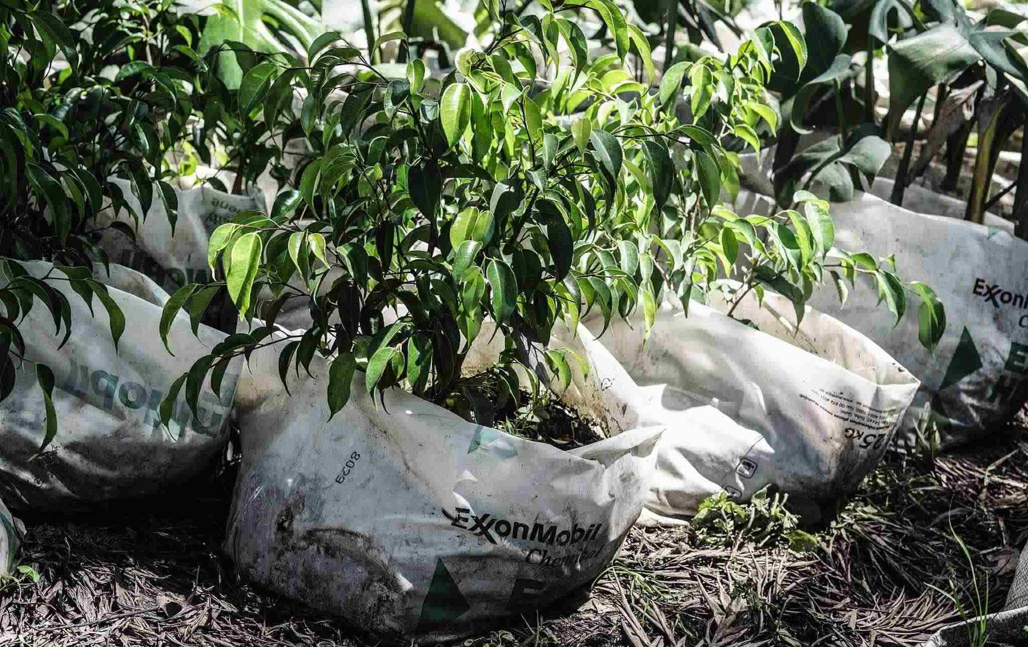 當(dāng)?shù)貢r間2023年5月7日,肯尼亞納庫魯?shù)拿缙岳?,??松梨诎b袋包裹著一棵樹苗。隨著世界充斥著塑料廢物,政府間談判委員會(INC)內(nèi)塑料條約的支持者正在倡導(dǎo)一項具有法律約束力的文書,減少石化工業(yè)生產(chǎn)的原生塑料。