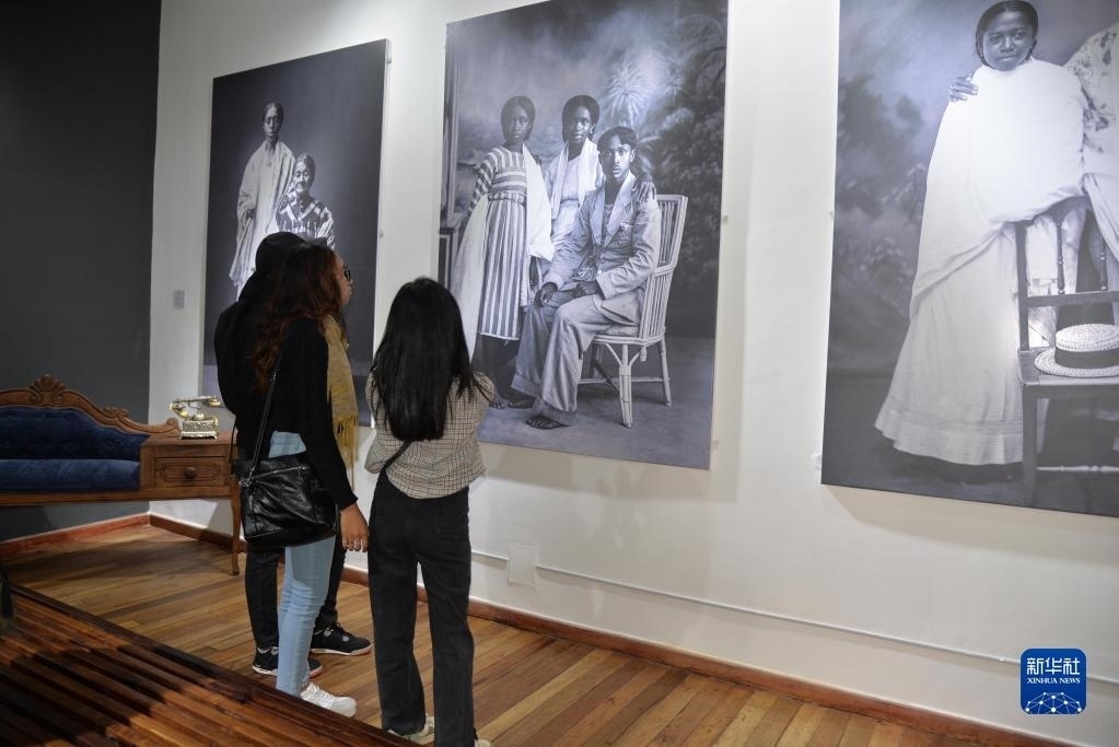 5月18日,在位于馬達(dá)加斯加首都塔那那利佛的照片博物館,當(dāng)?shù)貙W(xué)生參觀馬達(dá)加斯加傳統(tǒng)服飾圖片展。