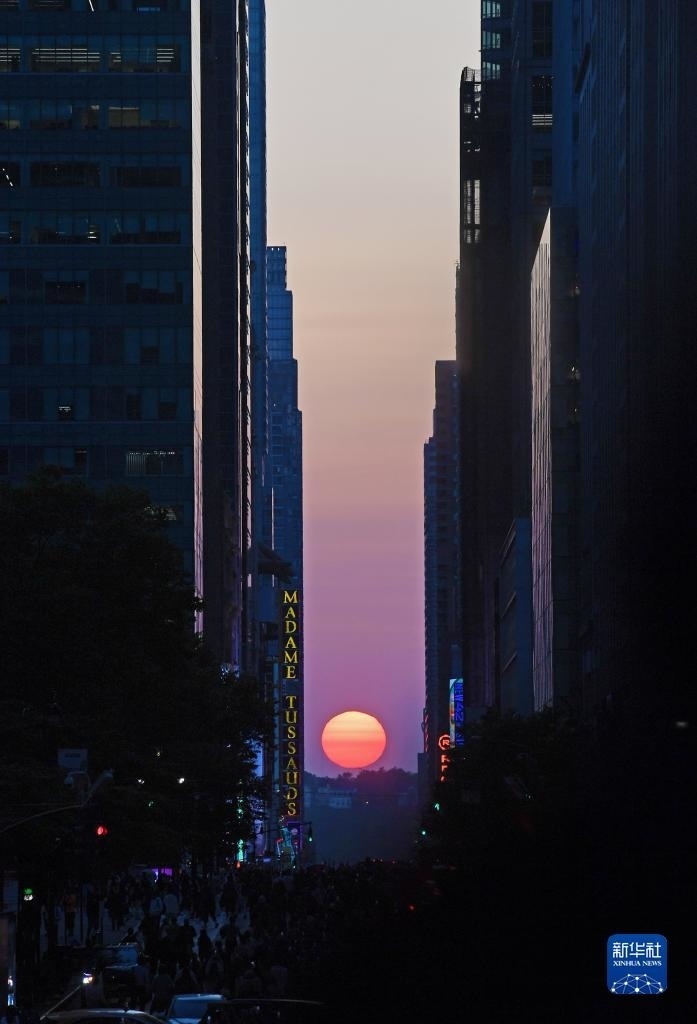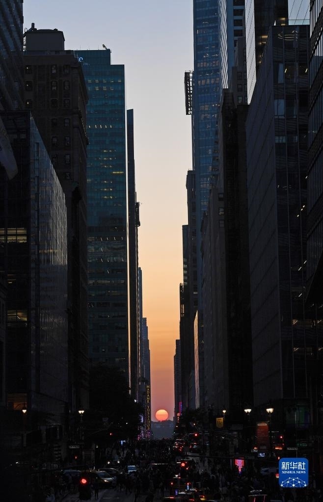 當日,紐約出現(xiàn)“曼哈頓懸日”景觀。“曼哈頓懸日”是紐約市標志性景觀,每年5月和7月出現(xiàn)兩次,指日落時太陽正好出現(xiàn)在曼哈頓東西向街道正上方、似乎懸在兩側(cè)高樓大廈之間的戲劇性畫面。新華社記者 李睿 攝