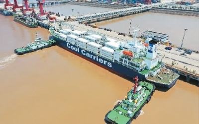 去年以來,浙江省玉環(huán)市持續(xù)加強對港口企業(yè)的引導力度,拓展大麥嶼港與東南亞國家、RCEP國家的合作。圖為一艘滿載6245噸新季獼猴桃的新西蘭貨輪停泊在大麥嶼港集裝箱碼頭,該航線是大麥嶼港于去年成功開通的RCEP國家水果進口航線,實現(xiàn)了入境水果業(yè)務(wù)零的突破。段俊利攝(人民視覺)
