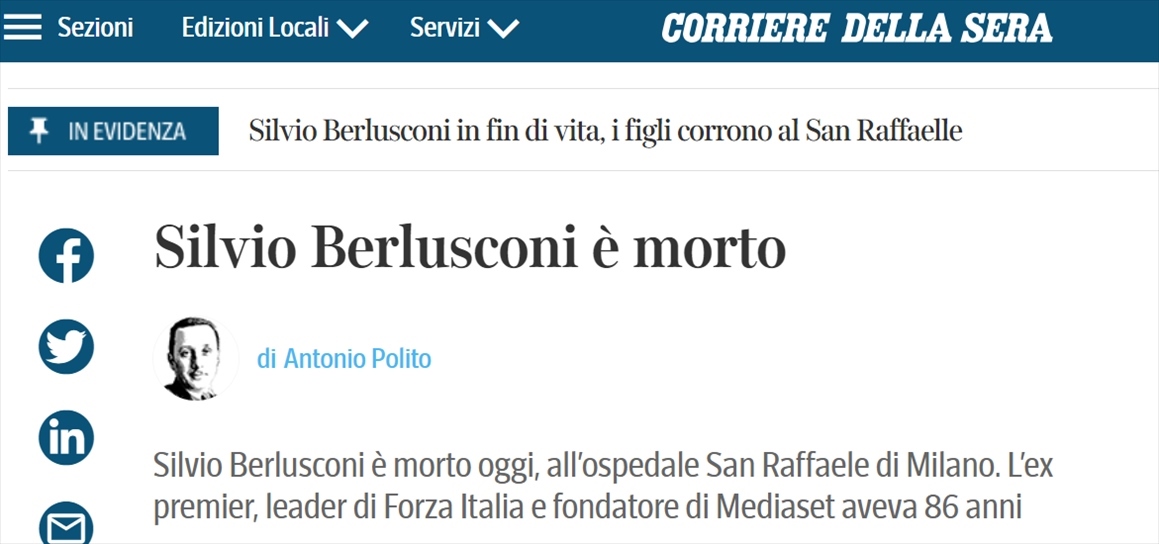 【環(huán)球網(wǎng)快訊】據(jù)俄新社12日援引意大利《晚郵報(bào)》的報(bào)道稱,意大利前總理貝盧斯科尼去世,終年86歲。另據(jù)法新社報(bào)道,意大利前總理貝盧斯科尼的發(fā)言人向該媒體證實(shí),貝盧斯科尼已經(jīng)去世。