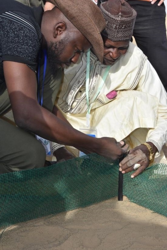 這位卡諾州環(huán)境部生態(tài)和林業(yè)主管按照中國(guó)專(zhuān)家的講授和示范,把條狀的可降解乳酸纖維沙袋灌滿(mǎn)沙子,擺成方格形狀,又拿起沉甸甸的鐵錘,把小樁子敲進(jìn)沙地里,圍上高密度固沙網(wǎng)。