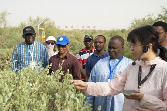 6月13日,在中國(guó)科學(xué)院新疆生態(tài)與地理研究所策勒沙漠研究站,中方專(zhuān)家向非洲和中亞學(xué)員介紹荒漠植物。新華社記者 周生斌 攝