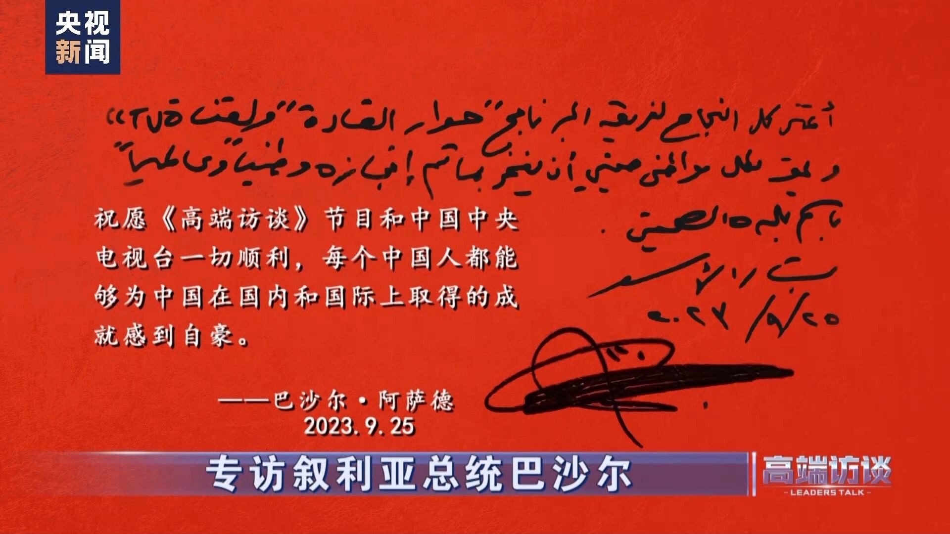 敘利亞總統(tǒng)巴沙爾在接受總臺(tái)專訪后題詞:祝愿《高端訪談》節(jié)目和中國中央電視臺(tái)一切順利,每個(gè)中國人都能夠?yàn)橹袊趪鴥?nèi)和國際上取得的成就感到自豪!