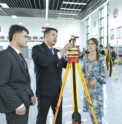 4月12日,在塔吉克斯坦首都杜尚別的魯班工坊內(nèi),來自天津城市建設(shè)管理職業(yè)技術(shù)學(xué)院的老師吳正鵬(左二)向?qū)W生講解測繪儀器使用方法。奧斯帕諾夫攝(新華社發(fā))