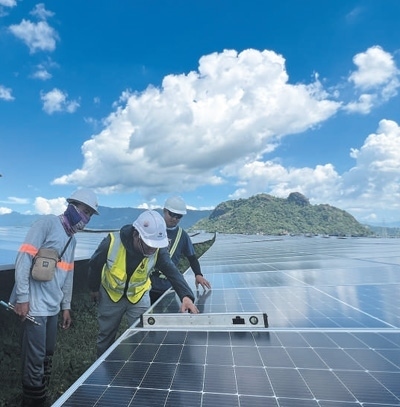 菲律賓圣馬塞利諾光伏項目由中國電力建設集團有限公司承建,項目建成后將成為該國最大的光伏電站,每年將為菲律賓供電5.9億千瓦時。圖為中方工程師(中)帶領(lǐng)菲方工作人員檢查調(diào)試光伏支架。楊獲然攝