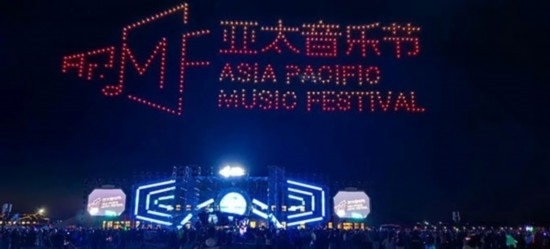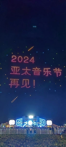 在氣氛最熱烈的時(shí)候,500架無(wú)人機(jī)緩緩升空,列隊(duì)表演,不斷變換陣型,時(shí)而在空中呈現(xiàn)出“亞太音樂(lè)節(jié)”、“中國(guó)外文局亞太傳播中心”、“太仆寺旗歡迎您”等巨幅字幕,時(shí)而呈現(xiàn)吉他、音符、蒙古包等色彩繽紛的圖案。