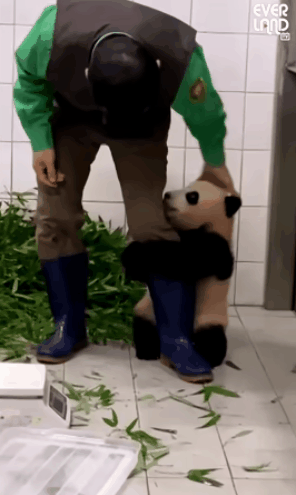 “福寶”抱著飼養(yǎng)員的腿撒嬌。(來源:愛寶樂園官方社交平臺賬號)