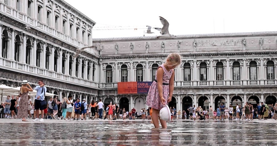 當(dāng)?shù)貢r間2023年8月4日,意大利威尼斯,兒童在積水中玩耍。