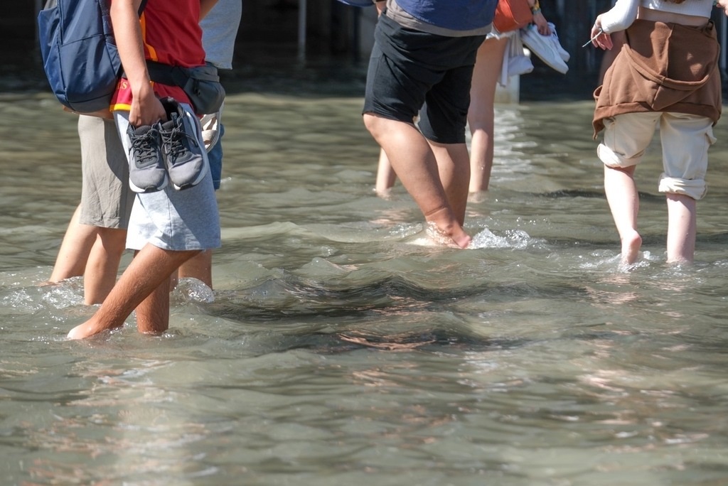 當(dāng)?shù)貢r間2023年8月6日,意大利威尼斯,城內(nèi)部分地區(qū)積水嚴重,游客光腳走在水中。