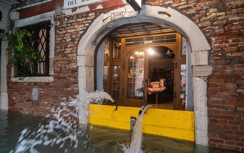 當(dāng)?shù)貢r間2019年11月17日,意大利威尼斯,當(dāng)?shù)厮汲掷m(xù)。一家餐廳用水泵排水。