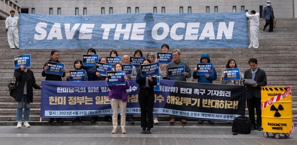 4月25日,在韓國首爾,民眾手舉標語抗議日本政府核污染水排海計劃。新華社發(fā)(李相浩攝)