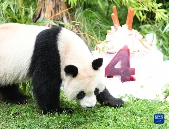 在當(dāng)天的活動(dòng)上,柏林動(dòng)物園看護(hù)團(tuán)隊(duì)為“夢(mèng)想”和“夢(mèng)圓”準(zhǔn)備了由蘋(píng)果和胡蘿卜等制成的多層冰激凌蛋糕,蛋糕上還有用甜菜根汁冰塊雕刻的數(shù)字“4”。
