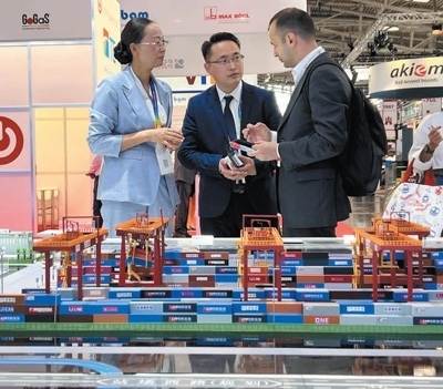 在2023年慕尼黑國際物流博覽會(huì)上,工作人員在中鐵集裝箱運(yùn)輸有限公司展臺(tái)前向國外客戶介紹廣州國際港中歐班列站點(diǎn)設(shè)施。本報(bào)記者 李 強(qiáng)攝