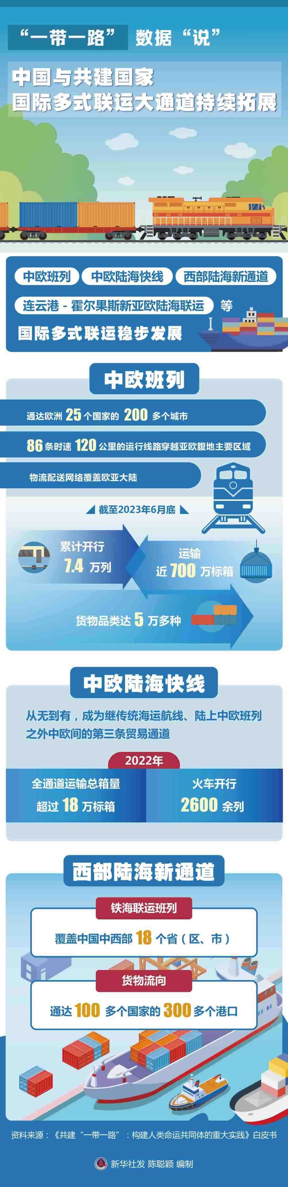 國際多式聯(lián)運大通道持續(xù)拓展。中歐班列、中歐陸??炀€、西部陸海新通道、連云港-霍爾果斯新亞歐陸海聯(lián)運等國際多式聯(lián)運穩(wěn)步發(fā)展。中歐班列通達歐洲25個國家的200多個城市,86條時速120公里的運行線路穿越亞歐腹地主要區(qū)域,物流配送網(wǎng)絡覆蓋歐亞大陸;截至2023年6月底,中歐班列累計開行7.4萬列,運輸近700萬標箱,貨物品類達5萬多種,涉及汽車整車、機械設備、電子產(chǎn)品等53大門類,合計貨值超3000億美元。中歐陸??炀€從無到有,成為繼傳統(tǒng)海運航線、陸上中歐班列之外中歐間的第三條貿(mào)易通道,2022年全通道運輸總箱量超過18萬標箱,火車開行2600余列。西部陸海新通道鐵海聯(lián)運班列覆蓋中國中西部18個省(區(qū)、市),貨物流向通達100多個國家的300多個港口。