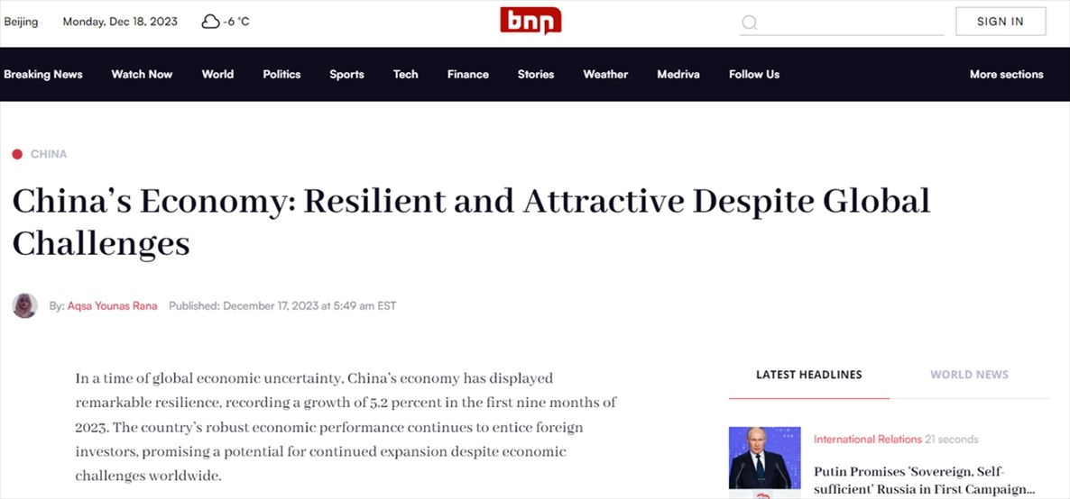 美國新聞網(wǎng)站BNN Breaking報道認為,在全球經(jīng)濟充滿不確定性的背景下,中國經(jīng)濟表現(xiàn)出驚人的韌性,2023年前三季增長5.2%。