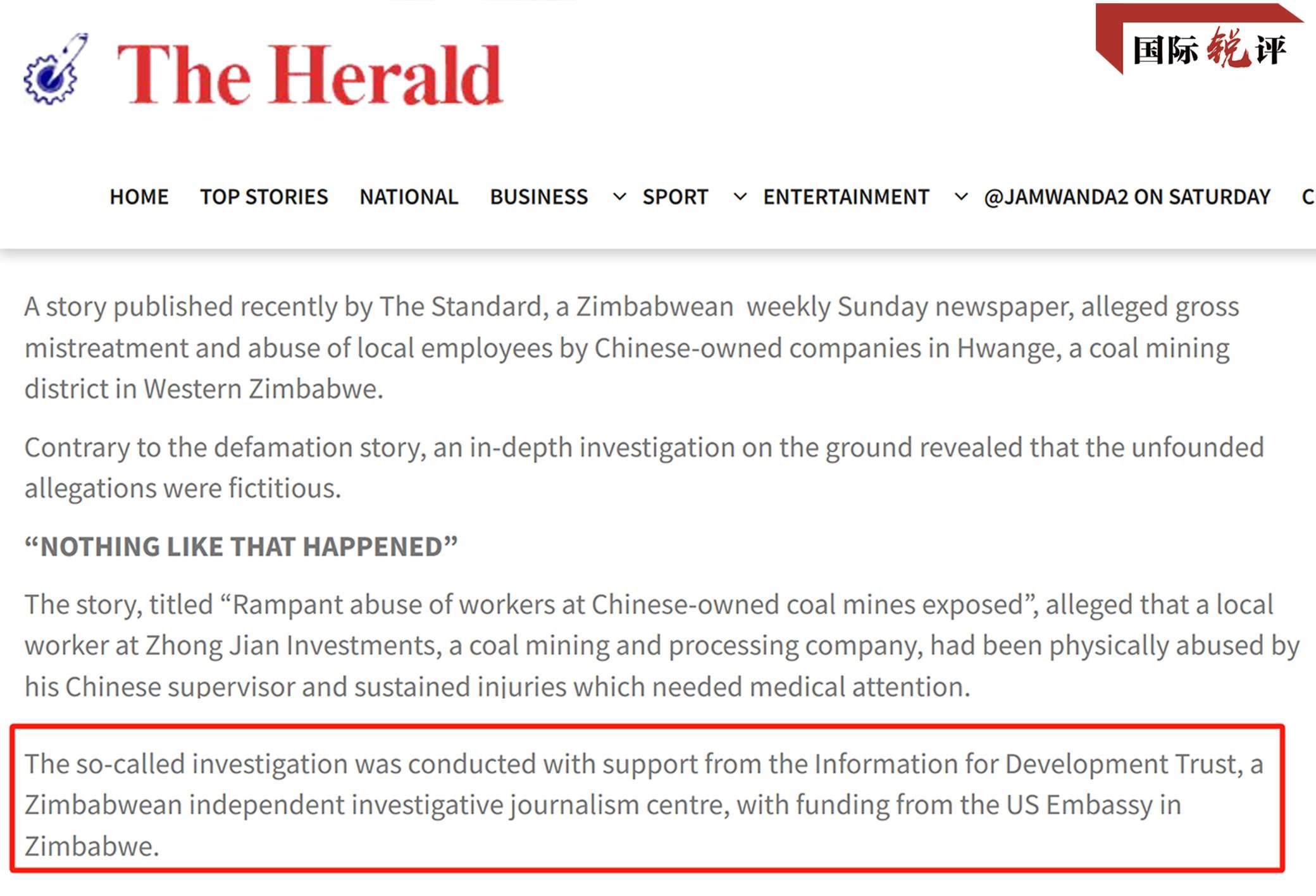 2022年5月,津巴布韋媒體《標(biāo)準(zhǔn)報》發(fā)布了一篇報道,污蔑中國礦企虐待當(dāng)?shù)貑T工,稱這名員工“受傷送醫(yī),還被解雇了”。這家媒體稱,報道是和津巴布韋一個名叫“信息促進(jìn)發(fā)展信托基金(IDT)”的機(jī)構(gòu)合作完成的。然而很快,津巴布韋《先驅(qū)報》就發(fā)文,用大量事實(shí)證明,這名員工只是和中方員工發(fā)生了小口角,并沒有被毆打,也沒有被解雇。