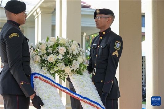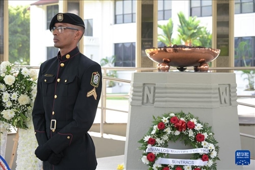 1月9日,在巴拿馬首都巴拿馬城,兩名士兵向紀(jì)念“護(hù)旗運(yùn)動”的“永恒之火”紀(jì)念碑獻(xiàn)花圈。新華社記者 陳昊佺 攝