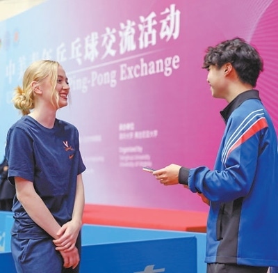 在中美建交45周年之際,北京市人民對外友好協(xié)會邀請美國弗吉尼亞大學(xué)代表團(tuán)訪問北京,并聯(lián)合北京市體育局共同舉辦以“重走乒乓路·一起向未來”為主題的中美青年乒乓球交流活動。在清華大學(xué)舉行的這場乒乓球友誼賽,便是此次交流活動的主要內(nèi)容之一。盡管是臨時組隊,但乒乓球迅速化解了兩國大學(xué)生初次見面的拘謹(jǐn),讓他們很快熟絡(luò)起來,整場比賽也在輕松愉快的氛圍中順利結(jié)束。賽后,兩國大學(xué)生又聚在一起自拍留念,互留聯(lián)系方式。