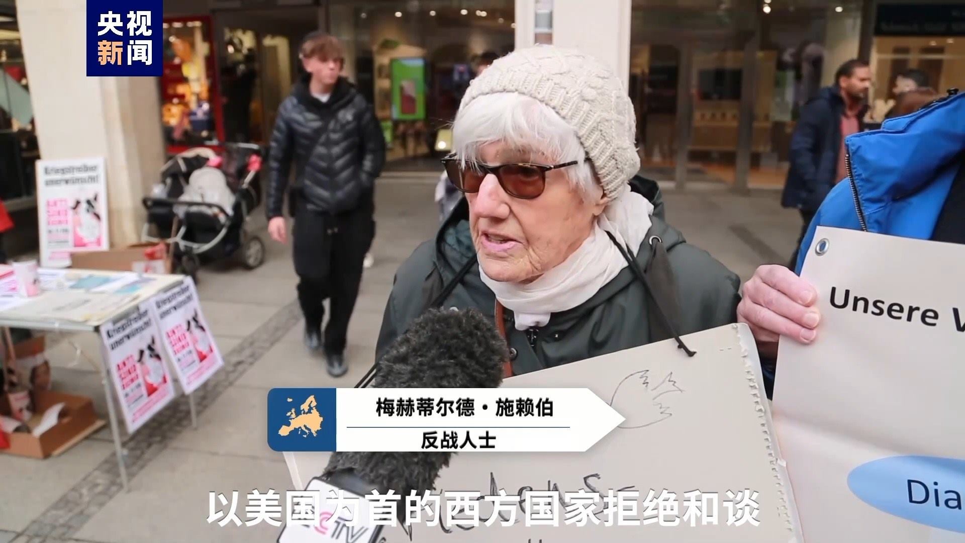 反戰(zhàn)人士 梅赫蒂爾德·施賴(lài)伯:以美國(guó)為首的西方國(guó)家拒絕和談。德國(guó)國(guó)防部長(zhǎng)說(shuō),我們必須做好戰(zhàn)爭(zhēng)準(zhǔn)備,運(yùn)送武器并且提高武器生產(chǎn)能力。這非常可怕。