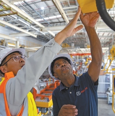 中國和南非兩國員工在南非東開普省北汽南非工廠焊裝車間內(nèi)工作。新華社記者 張譽東攝