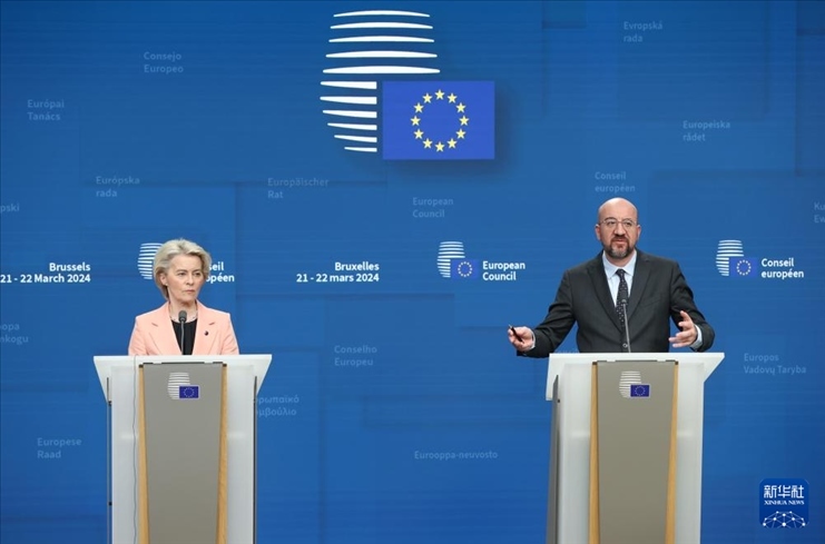 3月21日,在比利時(shí)布魯塞爾,歐洲理事會(huì)主席米歇爾(右)、歐盟委員會(huì)主席馮德萊恩在歐盟峰會(huì)期間出席新聞發(fā)布會(huì)。新華社記者 趙丁喆 攝