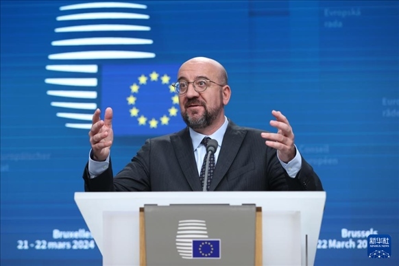 3月21日,在比利時(shí)布魯塞爾,歐洲理事會(huì)主席米歇爾在歐盟峰會(huì)期間出席新聞發(fā)布會(huì)。新華社記者 趙丁喆 攝